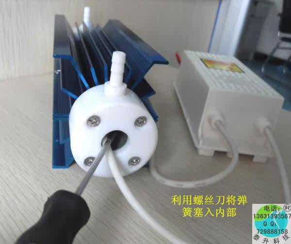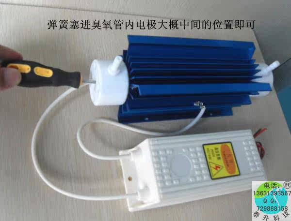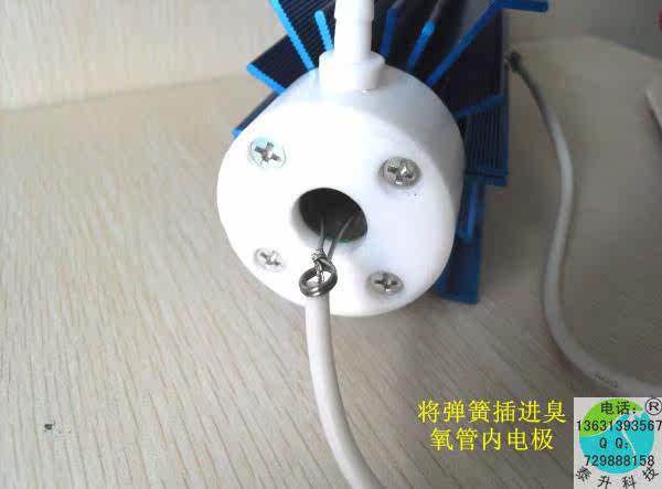 焊接有弹簧的高压线为高压正极,高压正极需要插入臭氧管中空的地方,并且放到臭氧管中间的位置,,没有焊接弹簧的高压线为高压负极,接到臭氧管散热片上的接线端子即可。请参考图示: