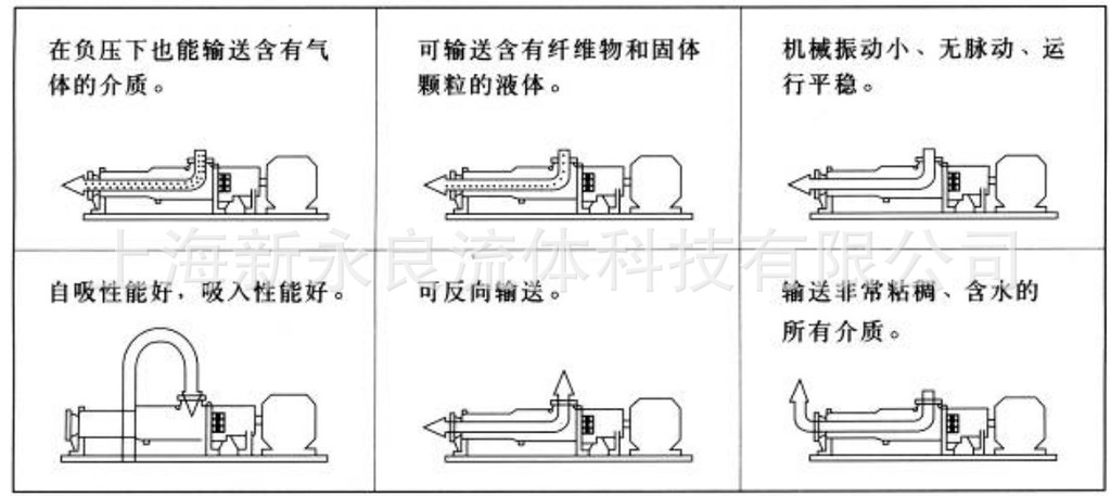 因定子选用多种弹性材料制成,所以这种泵对高粘度流体的输送和含有硬质悬浮颗粒介质或含有纤维介质的输送,有一般泵种所不能胜任的特点。其流量与转速成正比。