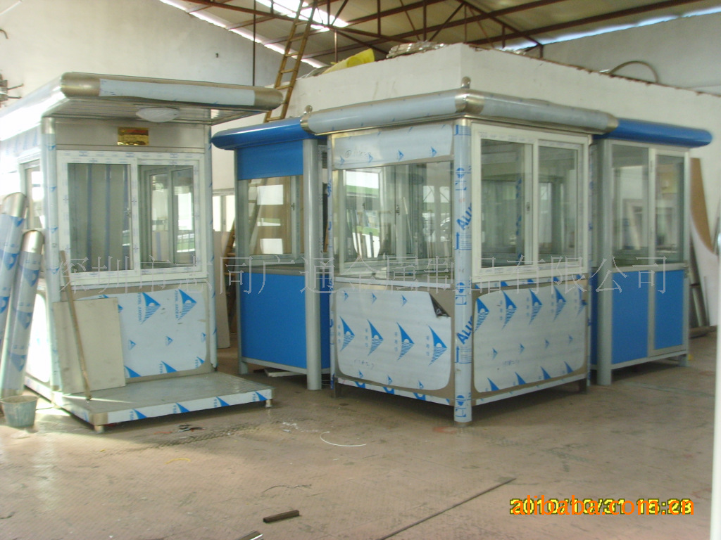 【产品材质】1、支撑柱:采用不锈钢成型1/4方柱焊接而成2、框架:采用不锈钢成型方通焊接而成3、圆弧裙边:采用优质不锈钢板成型焊接而成4、外面板:优质不锈钢板5、内面板:优质彩钢板6、岗亭内壁:中间为方通架,内外衬木板7、底座;底层为角钢架,中间为木板表层为防滑铝板8、内吊顶:豪华装饰板9、外顶:中间为方通架,表层为不锈钢板10、活动门:优质不锈钢板11、活动窗:塑钢12、标准配置:日光灯、开关、插座、暗敷线路【产品特点】1、岗亭材质表面经特殊工艺加工处理,精工制作而成,款型别致,品种繁多,美观大方、稳固耐用,适用于各种通道关卡及停车场。2、主题骨架采用优质不锈钢整体焊接而成,强度高,抗风压。3、顶部材料采用特殊防水铰接工艺,彻底解决漏水之患。4、所有岗亭留有空调及其它电器电源插座,方便使用。可根据您的特殊要求设计制造出不同款式的岗亭。深圳市志同广通交通设施有限公司是集生产销售道路交通安全设施、停车场安全设施和承接各种停车场工程施工,道路划线工程施工于一体的专业化公司。公司主要承接工厂停车场、厂区道路划线、学校停车场、学校道路划线、医院停车场、医院道路划线、生活小区停车场、生活小区道路划线、商业区停车场、商业区道路划线等各种交通施工工程。主要经营产品有:岗亭,道闸,标志牌,减速带,墙护角,防护桩,路锥,定位器,车位锁,广角镜,道钉,岗亭、道钉、地拱、橡胶减速垄、减速带、减速坡、缓冲带、路拱、凸面镜、反射镜、广角镜、挡车器、挡轮杆、定位器、路沿坡、路锥、方锥、防护桩、防护栏、墙直护角、墙圆护角、隔离栏、水马、弹力柱、柔性柱、交通标志牌、标牌配件、防撞桶、防撞块、道闸、遥控车位锁等、反光标识车身贴、车轮锁锁车器,私家车防盗锁,称重仪,太阳能交通标志(太阳能禁令标志、施工警示灯、警告标志、红绿信号灯、黄闪灯、指示标志、工程导向屏、工程指示车