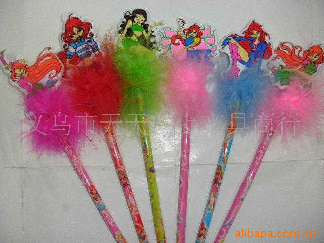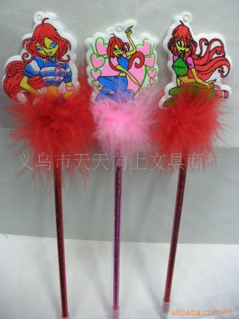 3:羽毛是经过多道工序生产而成。迎风飘扬的多色羽毛与笔杆颜色溶为一体,再搭配各种卡通造型,漂亮的花朵,爱心饰品,让整支笔充满活力。