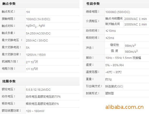 最大切换电压:250VAC/30VDC, 最大切换功率:1250VAC/150W 最大切换电流:5A
