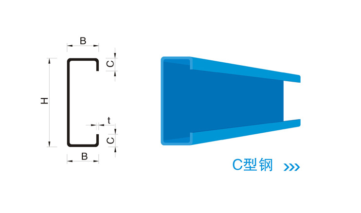 C型钢经热卷板冷弯加工而成,壁薄自重轻,截面性能优良,强度高,与传统槽钢相比,同等强度可节约材料30%。