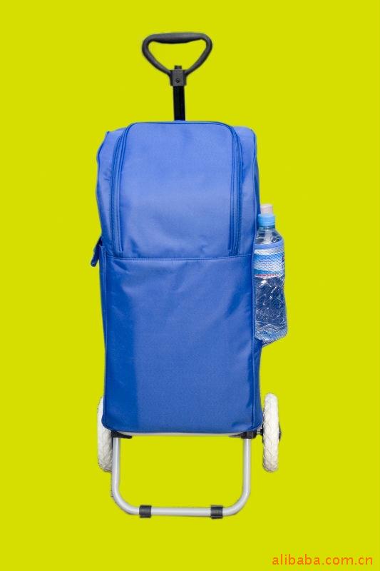材料:花瑶布(内衬铝箔),0.6mm 钢管,以及塑料配件。行李车尺寸:58cm×36cm×75cm 行李车折叠起来尺寸:37cm×66cm 冰包的体积:21cm×30cm×60cm 一套包装箱的尺寸:9.5cm×37cm×68cm