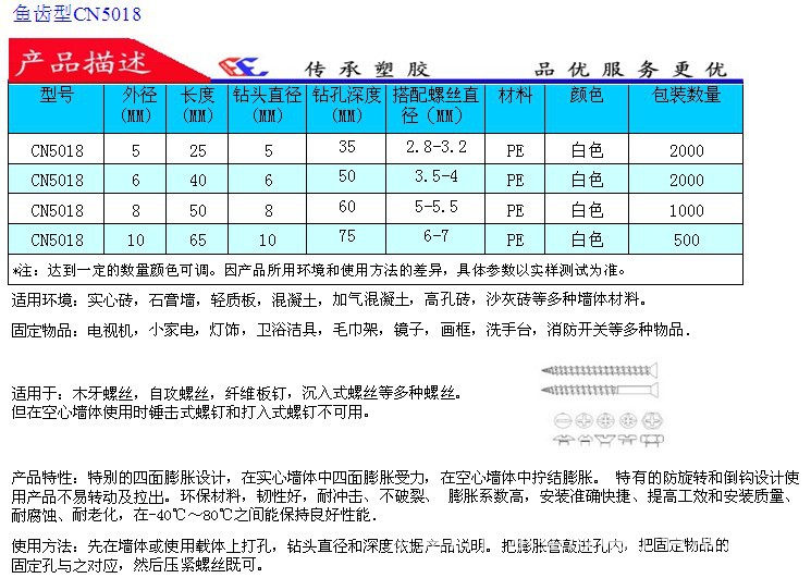 本公司生产销售-各类塑料膨胀管,塑料膨胀螺丝,塑胶膨胀螺栓,塑料膨胀螺栓,塑料壁虎,塑胶壁虎,塑胶膨胀螺丝,塑胶膨胀管,塑胶锚栓,塑料锚栓,华司,垫圈,垫片,尼龙膨胀等塑料配件。