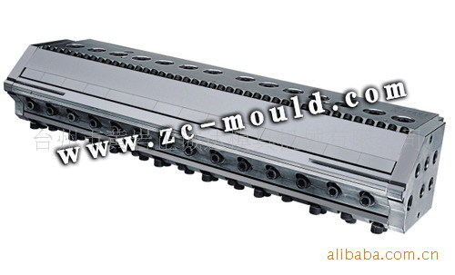 在模唇决可得到连续无阻拦的流面,装有微小间隔的调节螺钉树脂的压力与金属的上下反弹起作用,可弯曲模唇以调节模口间隙,拆卸,清洗,一连串的运转即快又容易,可生产0.015-1.5mm 的薄膜及片材.