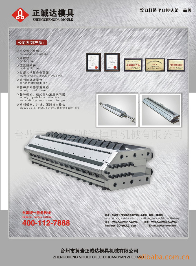 本司位于经济发达、风景秀丽的浙江东部沿海地区--黄岩拥有多年实际经验及先进的加工设备,己成功的开发了各种单层、多层共挤模头、2-5分配器、熔体计量泵、各种自动换网器、适应PC、PMMA、APET、PETG、ABS、PS、HIPS、PVC、PP、PE、PU、EVA、PVDC等原料、生产各种高技术的高透明板、彩板、发泡板、洁具板、中空阳光板、铝塑复合板、防水卷材、专用地板革、以及各种食品、服装、医药等包装材料、文具片材、光膜、压纹膜、淋膜、透气膜等!