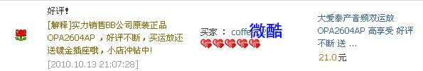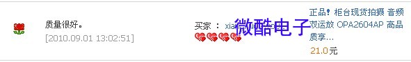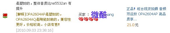OPA2604和OPA604都是Burr Brown公司的产品,OPA604为单运放,OPA2604为双运放。它们都是专为音频而设计的专用运放,音色醇厚、圆润,中性偏暖、胆味甚浓,是被誉为最有电子管音色的运算放大器。当年的价格也不低,但还是被许多音响发烧友选为摩机打磨音箱,耳机,CD,功放,DAC等都非常合适升级机器的对象!特别是在音箱最受欢迎~~~