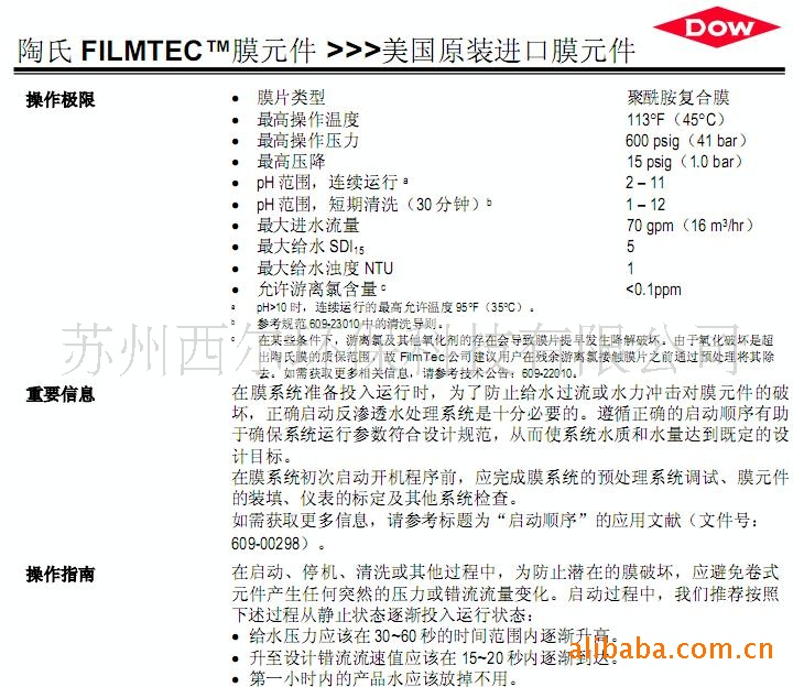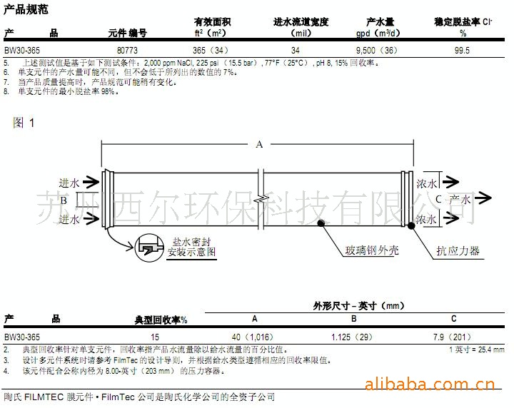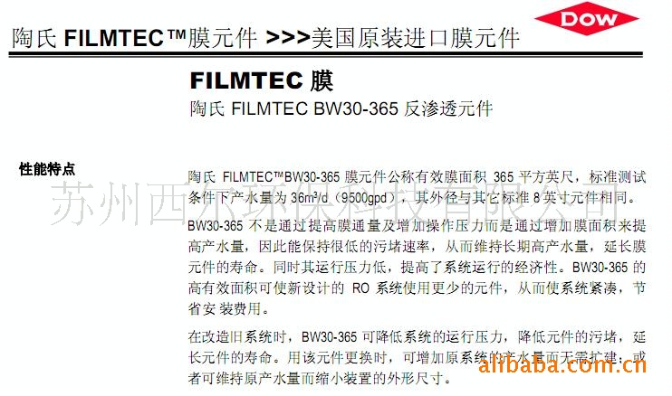 陶氏 FILMTEC BW30-365 膜元件的公称有效膜面积 365 平方英尺,标准测试条件下产水量为 36m 3 /d(9500gpd ) ,其外径与其它标准 8 英寸元件相同。 BW30-365 不是通过提高膜通量及增加操作压力而是通过增加膜面积来提 高产水量,因此能保持很低的污堵速率,从而维持长期高产水量,延长膜元件的寿命。同时其运行压力低,提高系统运行的经济性。 BW30-365 的高有效面积可使新设计的 RO 系统使用更少的元件,从而使系统紧凑,节省安 装费用。