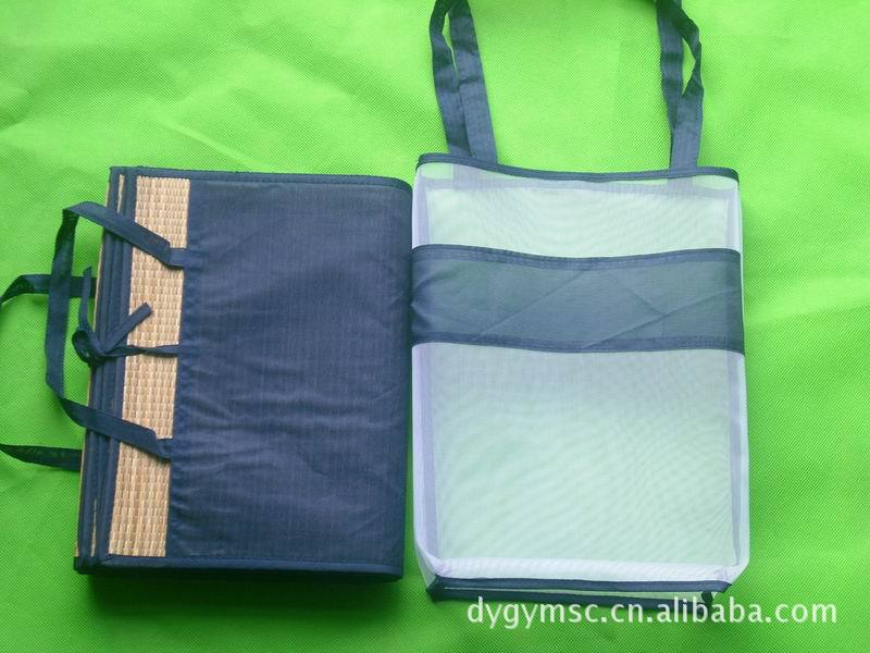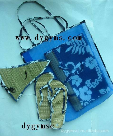 本厂生产的套装沙滩席有:丝网袋+沙滩席,丝网袋+沙滩席+拖鞋,也可按客户要求定做,产品质量可靠,价格合理,交货及时,欢迎新老客户来厂看样定购。