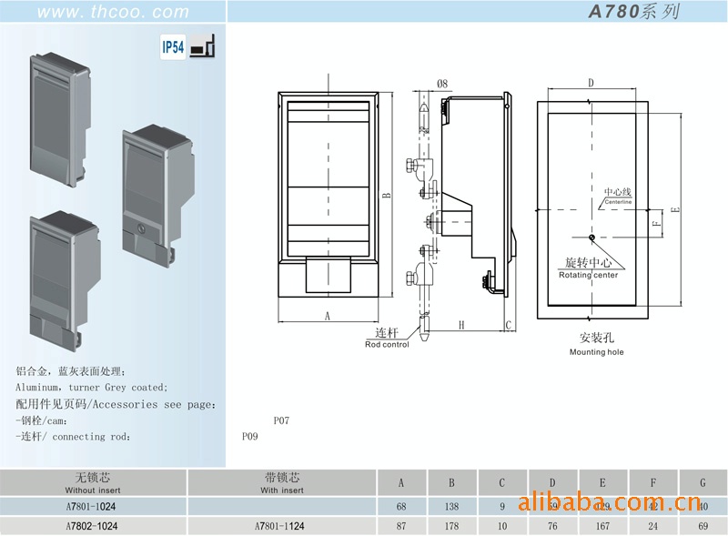 材质及表面处理:蓝灰铝合金基座.手柄.盖板。锌合金挂锁装置,镀锌钢钢栓.压板.转轴