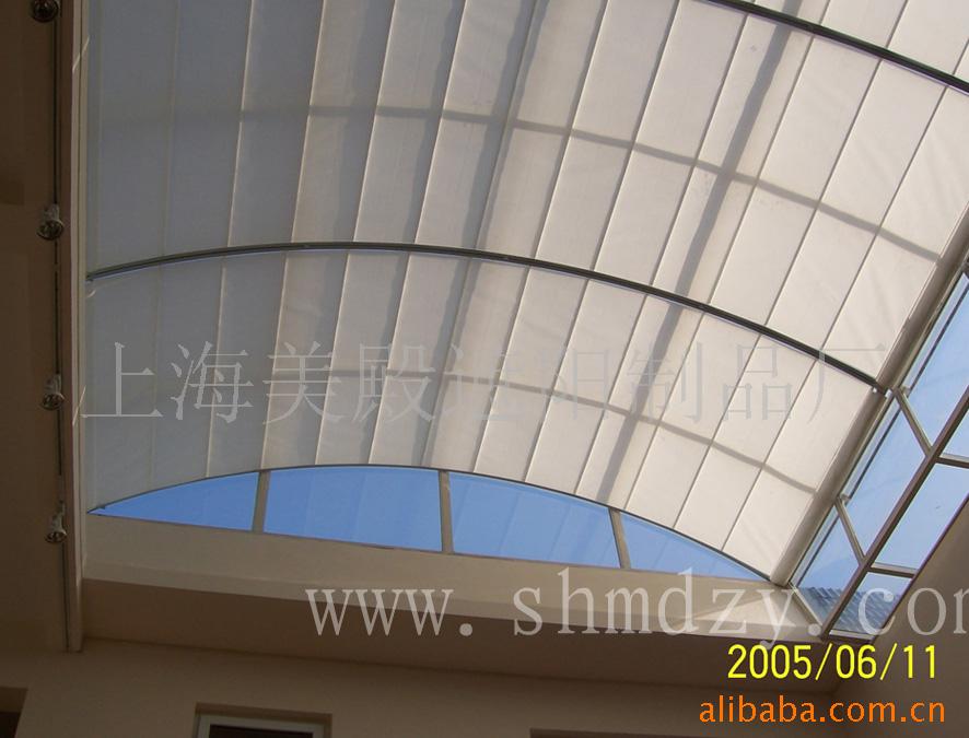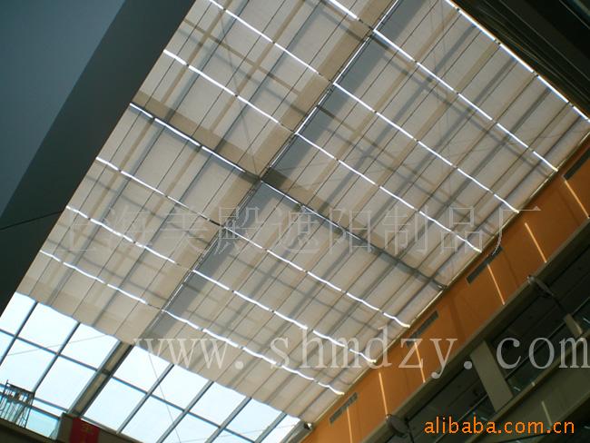 双轨折叠式天棚帘机构是固定在室内采光顶的内顶部或斜侧面玻璃采光窗框可以收放的遮阳系统。