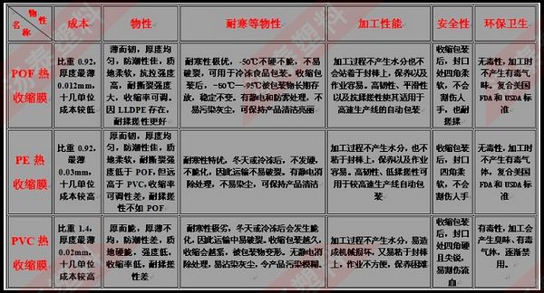 POF热收缩膜 PE热收缩膜 PVC热收缩物理性能对比: