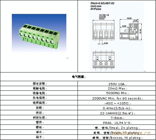 插拔式端子台,提供3.50mm\3.81mm\5.00mm\5.08mm等不同间距为了应用不同场合的使用需要,其插座提供水平型及垂直型两种方向。均使用压线框接线方式,无需维护、耐振动、防松脱、接触面积大、使用信赖高,所有产品均符合IEC60998、UL1059等国际标准,且大多通过UL认证部分通过VDE等认证。采用高信赖接线结构及专业化的生产模式,品质安定,适合产业和工业控制与资讯产业使用
