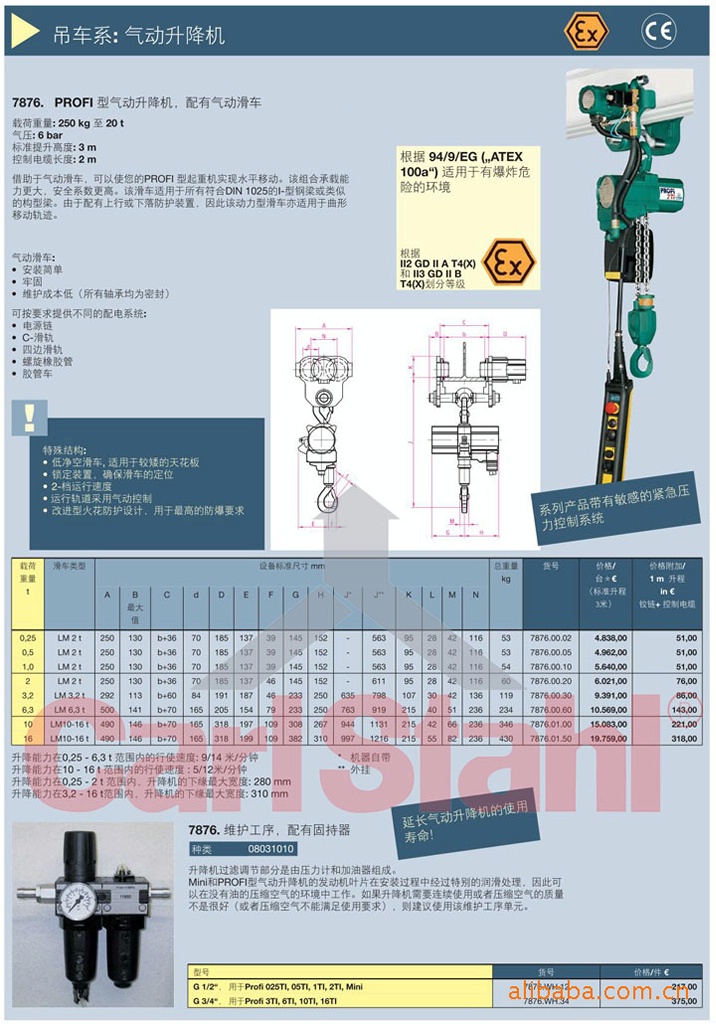 7876. PROFI型气动升降机,配有气动滑车