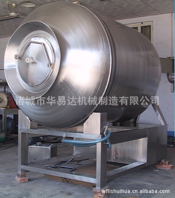 真空滚揉机是在真空状态下,利用物理冲击的原理,让肉在滚筒内上下翻动,相互撞击、摔打,达到按摩、腌渍的作用,使肉均匀的吸收腌渍,提高肉的结着力及产品的弹性;本机具有肺呼吸功能,让产品在滚筒内做膨胀、缩小的往复运动,改善了肉组织的结构,提高了切面效果,增加了出品率。可以增强保水性,改善产品的内部结构。