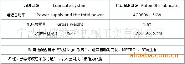 机械性能参数指标 | 性能指标项 | 标准值 | 定位精度 Positional precision | 0.008/300mm | 重复定位精度 Repeat positional precision | 0.005mm | 最大工作行程 Travel(X Y Z) | 450×500×200mm | 工作台面积 Table | 450×500mm | 工作台最大负重 Maximal capacity of table | 400kg | 最大进料高度、宽度Max inputting height、width | 250mm、590mm | 主轴功率 Power of the spindle | 3kw | 主轴转速范围 Pange of spindle speeds | 500-21000/24000rpm | 主轴冷却系统 Spindle cooling system | 水冷/油冷 Water-cooled/Oil-cooled | 主轴弹簧夹头 Spindle Spring collet | ER20 (ø3.175-ø12mm) | 最大移动速度 Maximal moving feed | 8000mm/min | 驱动系统 Driving system | 日本伺服电机 Servo motor of Japan | 数控系统 Numerical control system | 台湾新代 SYNTEC | 丝杆 Screw | 台湾银泰滚珠丝杆 | 导轨 Guide | 台湾上银直线导轨 | 润滑系统 Lubricate system | 自动润滑系统 Autom0tic lubricate | 电源总功率 Power supply and the total power | AC380V,5KW | 机床总重量 Gross weight | 1.6T | 机床外型尺寸 Size | 1.8×1.6×2.2M | | ※可选配西班牙“发格fagor系统”、进口自动对刀仪:METROL、BT电主轴 | ※注:参数修改恕不另行通知,以本公司技术标准为依据 | |