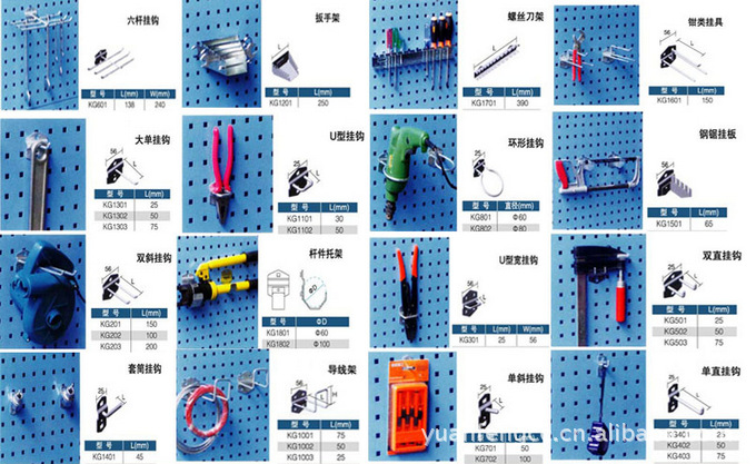 螺丝刀架|六杆挂钩|套筒挂钩|钻头架|挂板挂钩所有挂钩底座均采用2mm冷板材质,表面作白锌处理。产品及规格主要有: