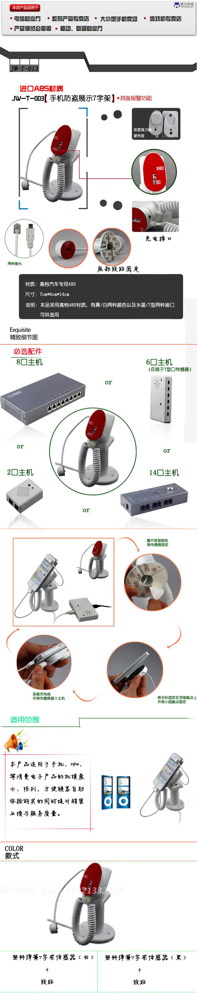 2、配置主机:广泛应用于各种消费类电子产品卖场、产品展览会、博览会的产(样)品展览柜、电子数码商场产品柜、手机专柜等在内的防盗安装,能有效的保护各类数码产品、电子礼品如手机、MP3、MP4、耳机等小型电子陈列品,以及高档工艺礼品、饰品等,以防备产品丢失!
