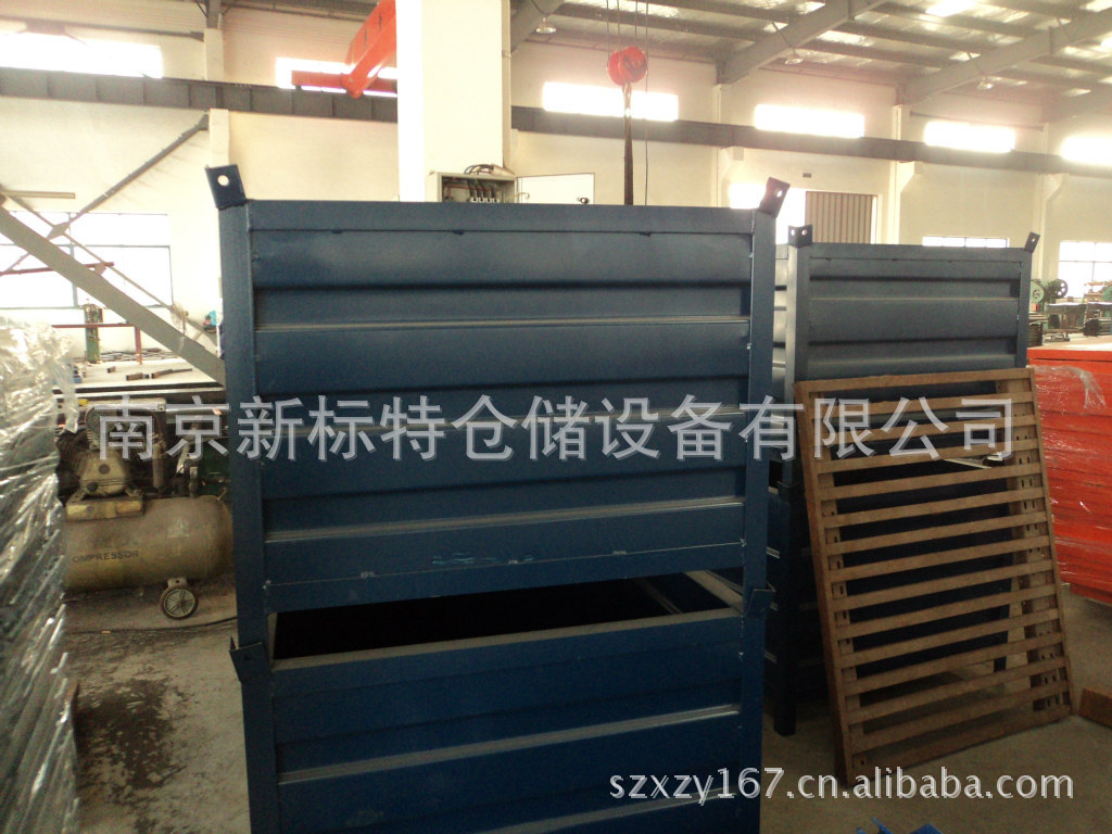 钢板焊接而成,牢固耐用,四壁压径加固,底部钢板厚度2mm,四壁钢板厚度1.5mm.专用的产脚结构,可堆叠也可方便叉车搬运,最大存载4000kg;金属周转箱是存放生产品的主要周转容器,它适用范围广,配合叉车使用更快捷,更实用。普通仓库笼相比更强调结构强度、多层堆垛安全性和使用寿命,被欧洲企业广泛应用,特别适用于工厂间的运输、包装、仓库储存和厂内周转。