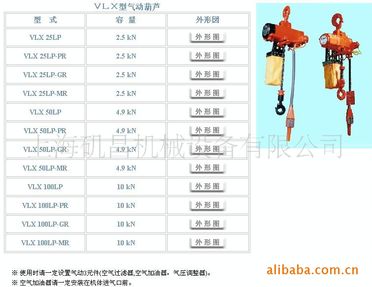 VLX型气动葫芦采用吸盘离合刹车式(空气过滤器,加油器,气压调整器) 。