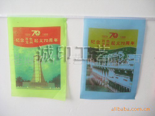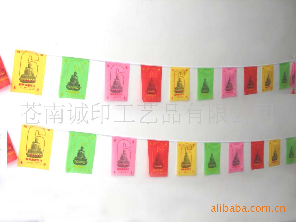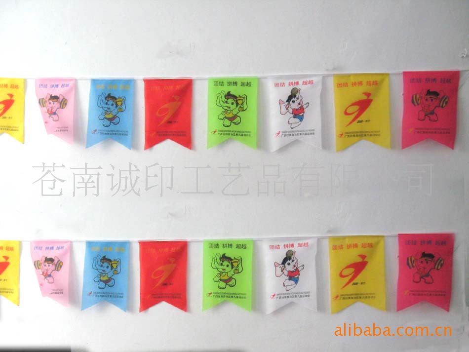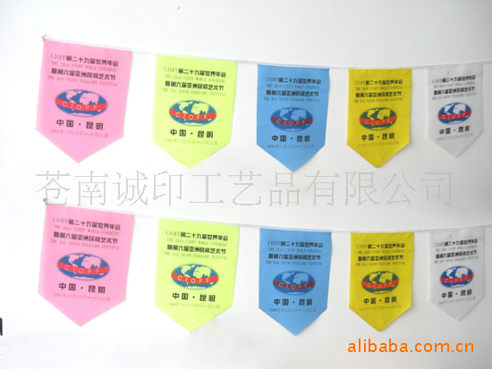 此款彩旗为热转印,渐变清晰,色彩亮丽 有红,黄,绿,蓝四种颜色 ,悬挂起来更能体现节日的欢快气氛。