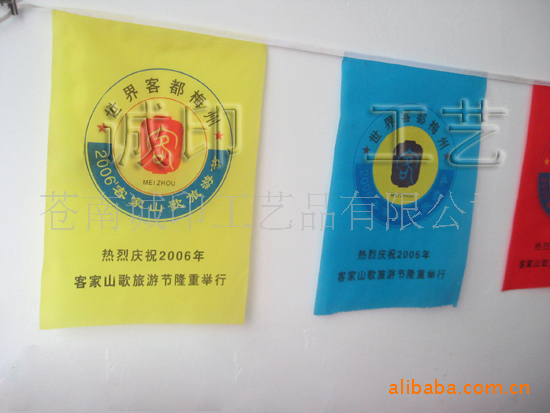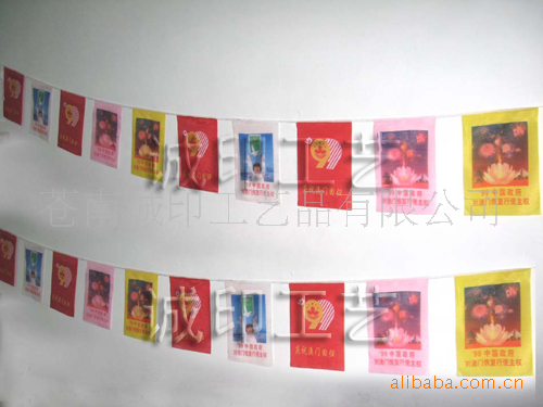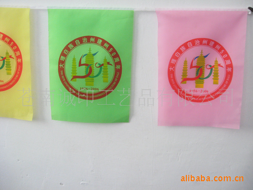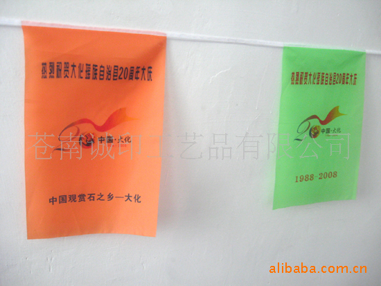 彩旗特点:印花清晰,套色精准,颜色牢固,可长时间悬挂于户外。