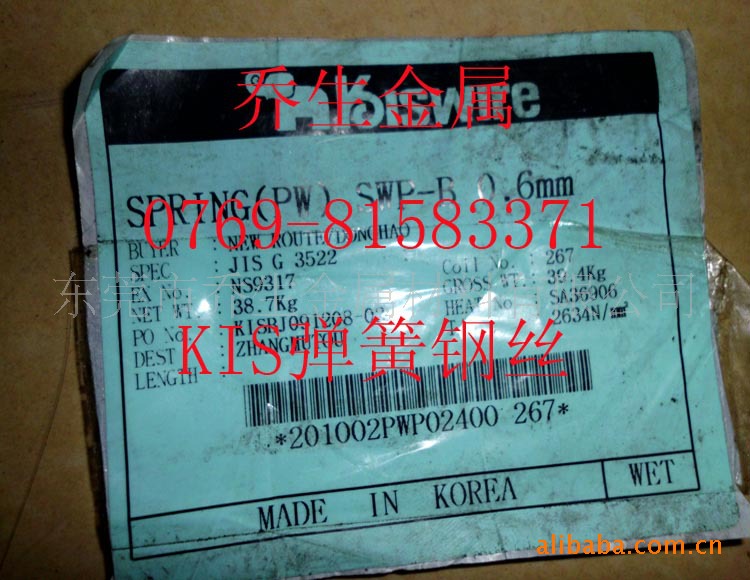 具体产品:琴钢线SWP-B/A/G,山凤牌弹簧钢丝T9A 82B T8MNA 65MN,国产琴钢丝,韩国琴钢丝,KIS琴钢丝,DSR琴钢丝,日本ROKKO六甲琴钢丝,日本SUZUKI铃木琴钢丝,韩国象牌KOS/KIS钢丝,镀镍钢丝,高碳钢丝,韩国KIS象牌高碳钢丝SWC,日本铃木SUZUKI铃木高碳钢线,日本ROKKO六甲高碳钢丝,韩国大新DSR/象牌KOS不锈钢弹簧线,宝钢不锈钢弹簧钢丝,日本铃木不锈钢丝,日本精线NAS SUS304 SUS301,SK4,SK5 SK7及SUS301 304 316不锈钢钢带等金属材料。
