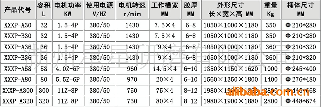 2、研磨机有XXXP-30/36/60/80/300/320等型号机器,研磨滚筒内衬有橡胶和PU两种胶体;研磨滚筒装载有水平式和倾斜式两种;链条传动、同步带传动和齿轮传动三种不同传动方式,另有调速电机调速和变频调速。
