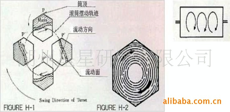 本机器采用行星传动方式,利用离心运动原理。有4个 6角滚筒装载于料斗中(料斗固定装载在转动盘上;58型以上滚筒固定在转动盘上。),当转动盘转动时,滚筒以逆方向转动。将工件、研磨石、水与抛光助剂放进滚筒后,将滚筒予以固定时,物体被离心力转动,此时物体受滚筒槽的强压力(参照图)
