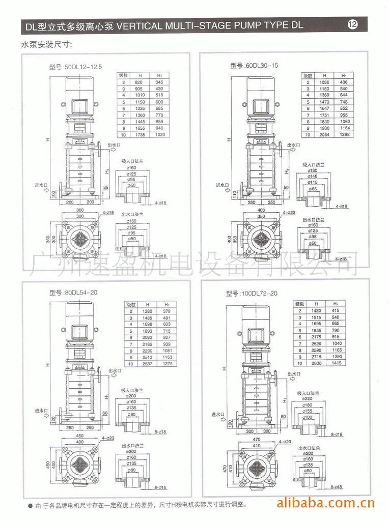 · 转速:1450r/min 性能表: 规格 | 流量 | 扬程 m | 转速 转/分 | 功率 Kw | 效率 % | 必须汽蚀余量 m | 叶轮 直径 mm | 重量 Kg | m3/h | L/s | 轴功率 | 配用功率 | 50DL12-12.5*2 | 12.6 | 3.5 | 25 | 1480 | 1.56 | 3 | 55 | 2.2 | 207 | 175 | 50DL12-12.5*3 | 12.6 | 3.5 | 37.5 | 1480 | 2.34 | 3 | 55 | 2.2 | 207 | 196 | 50DL12-12.5*4 | 12.6 | 3.5 | 50 | 1480 | 3.12 | 4 | 55 | 2.2 | 207 | 225 | 50DL12-12.5*5 | 12.6 | 3.5 | 62.5 | 1480 | 3.9 | 5.5 | 55 | 2.2 | 207 | 266 | 50DL12-12.5*6 | 12.6 | 3.5 | 75 | 1480 | 4.68 | 5.5 | 55 | 2.2 | 207 | 287 | 50DL12-12.5*7 | 12.6 | 3.5 | 87.5 | 1480 | 5.46 | 7.5 | 55 | 2.2 | 207 | 321 | 50DL12-12.5*8 | 12.6 | 3.5 | 100 | 1480 | 6.24 | 7.5 | 55 | 2.2 | 207 | 342 | 50DL12-12.5*9 | 12.6 | 3.5 | 112.5 | 1480 | 7.03 | 11 | 55 | 2.2 | 207 | 402 | 50DL12-12.5*10 | 12.6 | 3.5 | 125 | 1480 | 7.83 | 11 | 55 | 2.2 | 207 | 423 | 65DL30-15*2 | 30 | 8.33 | 30 | 1480 | 3.89 | 5.5 | 63 | 2.5 | 214 | 280 | 65DL30-15*3 | 30 | 8.33 | 45 | 1480 | 5.83 | 7.5 | 63 | 2.5 | 214 | 350 | 65DL30-15*4 | 30 | 8.33 | 60 | 1480 | 7.78 | 11 | 63 | 2.5 | 214 | 436 | 65DL30-15*5 | 30 | 8.33 | 75 | 1480 | 9.7 | 11 | 63 | 2.5 | 214 | 486 | 65DL30-15*6 | 30 | 8.33 | 90 | 1480 | 11.67 | 15 | 63 | 2.5 | 214 | 544 | 65DL30-15*7 | 30 | 8.33 | 105 | 1480 | 13.61 | 15 | 63 | 2.5 | 214 | 590 | 65DL30-15*8 | 30 | 8.33 | 120 | 1480 | 15.56 | 18.5 | 63 | 2.5 | 214 | 694 | 65DL30-15*9 | 30 | 8.33 | 135 | 1480 | 17.5 | 22 | 63 | 2.5 | 214 | 765 | 65DL30-15*10 | 30 | 8.33 | 150 | 1480 | 19.45 | 22 | 63 | 2.5 | 214 | 811 | …………………………………… |