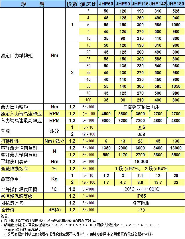 外框尺寸目前備有60/90/115/142/180等型式,內部採用精密型螺旋行星齒設計,具有提高齒輪嚙合率、運轉更加平順、低噪音、高出力轉矩及低背隙等特色。