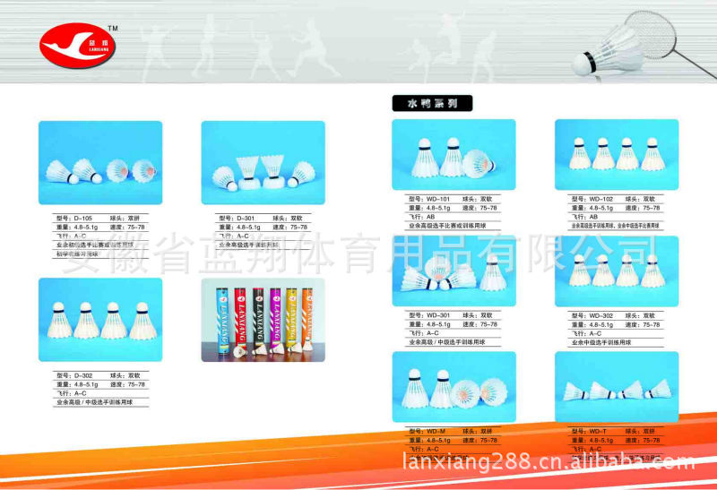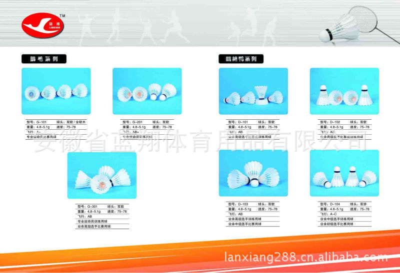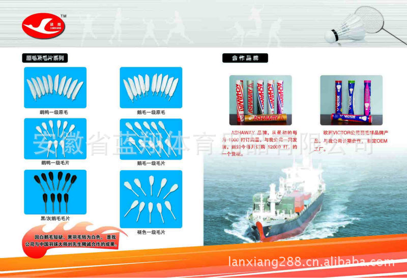 安徽蓝翔有限公司是专业生产高品质羽毛球的企业,坐落在羽毛资源十分丰厚的董桥村,是一家集收购、加工、成品销售为一体的羽毛制品企业。公司秉承几十年的羽毛制品制作经验,引进先进的技术工艺,实施品牌战略(品牌为蓝翔),参与市场竞争。目前,公司拥有雄厚的技术力量(专家刘强宁常年坐镇指导),拥有最新的羽毛球生产流水线(有冲毛机20台,插球机10台,量毛机4台,织线机6台,滚胶机5台,以及相关的辅助机器。),年产60万打中、高挡羽毛球(出口为主)的生产能力,检测手段先进(有试球机2台),,严格保证质量。蓝翔公司以“重合同,守信用”为宗旨,愿长期与国内外新老客户建立广泛的合作与往来。竭诚欢迎广大商家朋友前来洽谈(批发、零售、直销、代理等多种销售方式)。QQ156849127