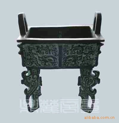 西周早期。1979年陕西宝鸡市竹园沟出土。长方槽形,方唇折沿,鸟形扁足,四壁饰以雷纹为地的兽面纹,内壁铸有铭文“佰作彝”3字。鼎是奴隶主贵族用以“别上下,明贵贱”的重要青铜礼器,史载西周天子九鼎,诸侯七鼎,卿大夫五鼎,士三鼎或一鼎。说明它是权力的象征。现代人把它作为鼎盛繁荣的化身,鼎立相助的承诺。