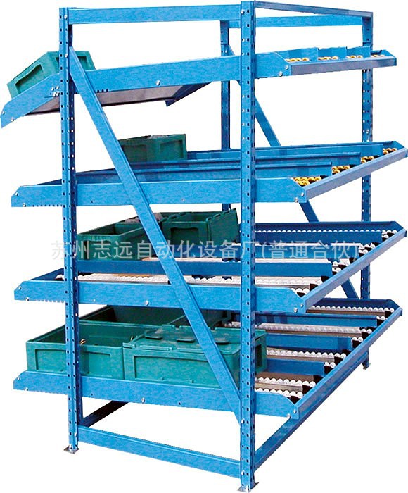 6、单元货架每层载重量通常在1000kg以内,货架高度在2.5米以内。1、滚轮式货架又叫流利式货架,此类型货架通常由中型横梁式货架