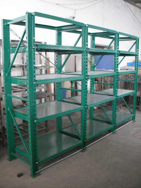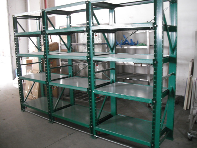 用于存放中小型模具,顶部选配手拉葫芦移动车,便于模具的超吊和存放,抽屉板下设置有滚轮轨道,使重载后依然能用很小的力轻松拉动,通常每层最大可承载量800KG。