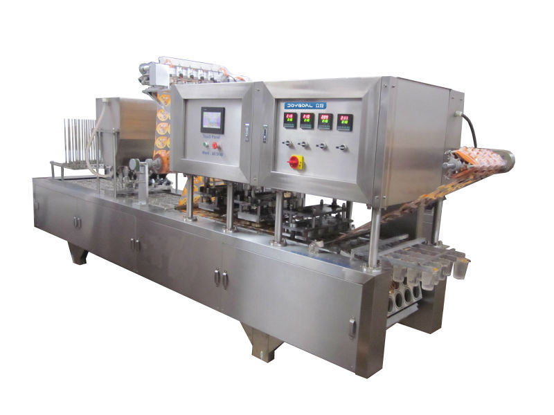 该机采用不锈钢制造,适用于各种形状的塑料杯盒的液体灌装封口。采用自动落杯、单杯两次灌装液体、两次封口、一次剪切、产品退出为全自动化;色标由光电自动跟踪图案,修正封口膜图纹位置;综合气,电,机械为一体设计;质量可靠,高效节能.