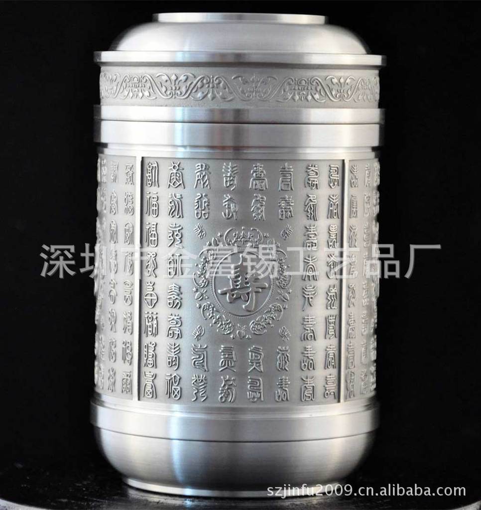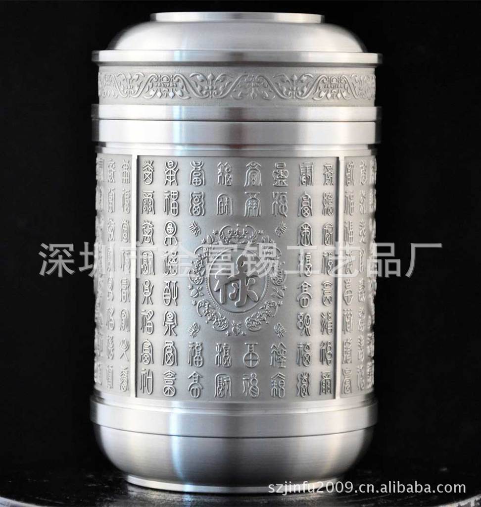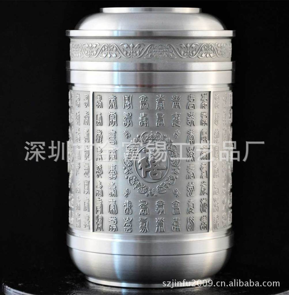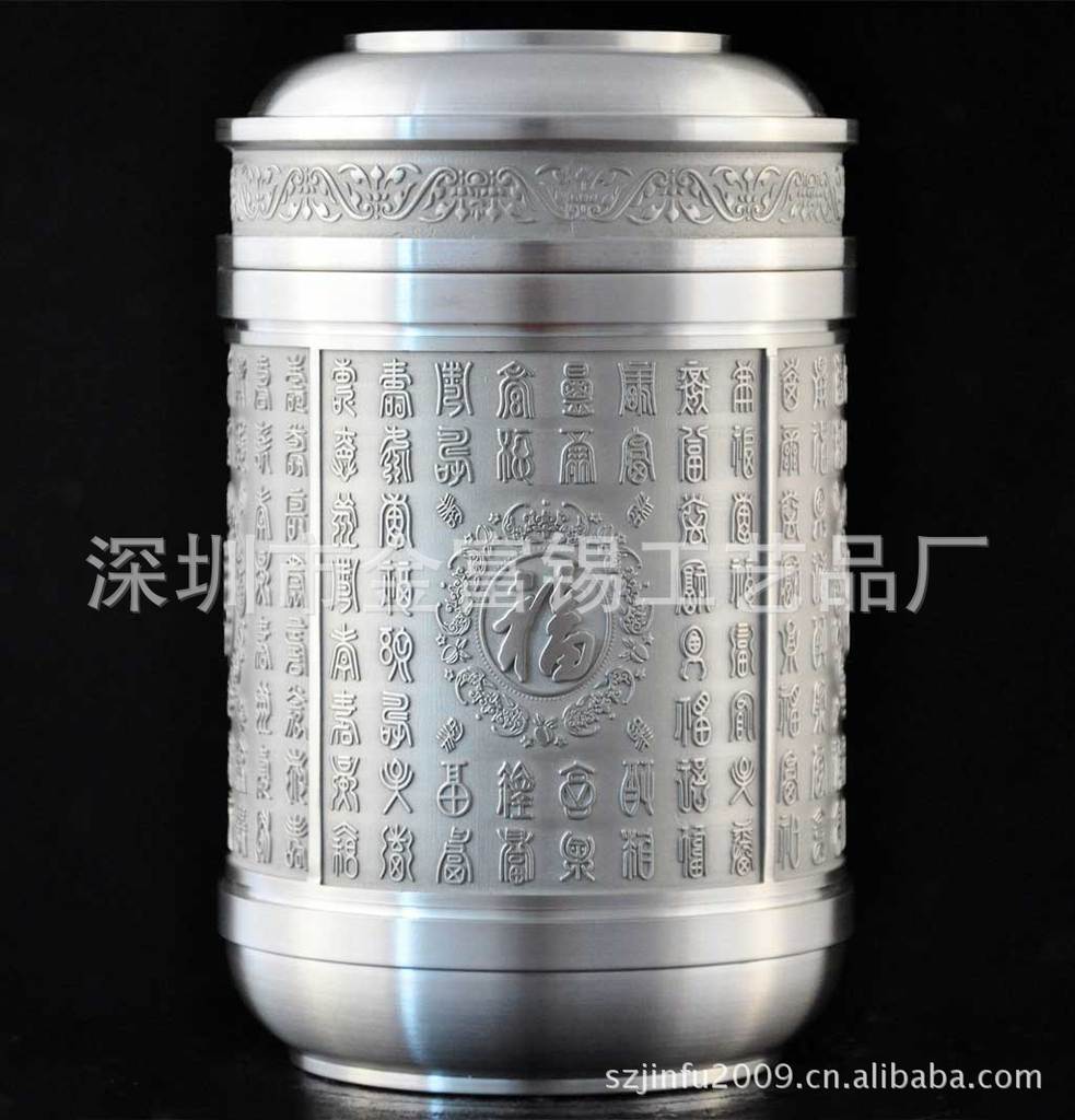 罐身以“福”、“禄”、“寿”、“禧”为图,寓意“福寿齐天、福寿无疆,福如东海,寿比南山。 纯锡茶叶罐,因锡良好的密闭性和透气性,不仅可以有效防潮,更能保持茶叶的鲜美芳香和持久,故自古为储茶之极品。