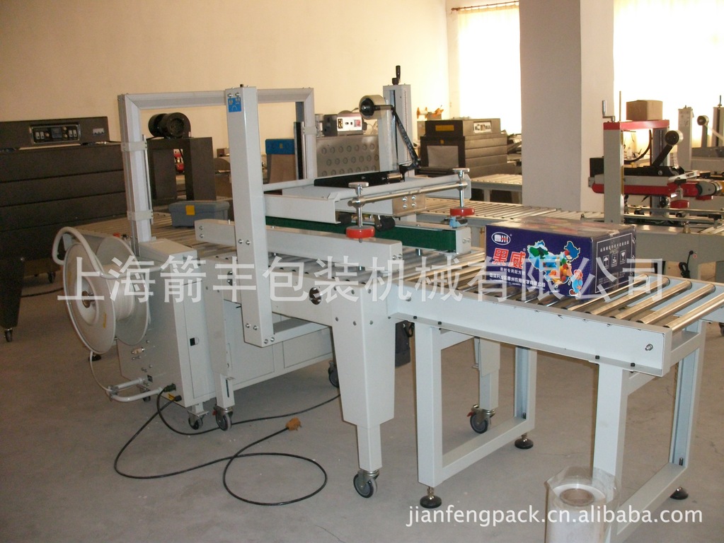 此系统结合自动封箱机及全自动捆包机(采用台面滚筒无动力),针对顾客封箱及捆包需求并节省人工成本,双机一体设计,使封箱、捆包作业一体化; ※ 两侧皮带传动,主传动机构使用特殊培林座,高精密、低噪音,增加皮带使用寿命; ※ 采用PLC控制系统,两侧驱动皮带加长300MM、安装2组或多组光电开关,可设置捆包的条数; ※ 采用梯形丝杆同步调节宽窄高低,结构设计可靠; ※ 纸箱两端封箱胶带折角长度50~65mm。 ※ 主要应用工业:医药、印刷、食品、饮料、化妆品、书籍等产品的外包装 |
