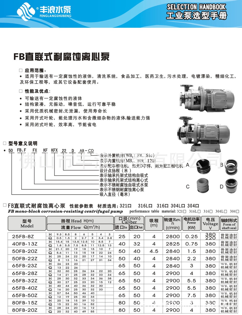 FB直联式耐腐蚀离心泵性能参数表材质选用:316L口 316口 304L口304口
