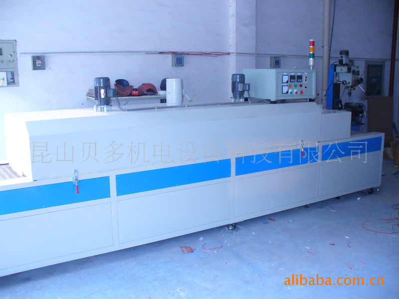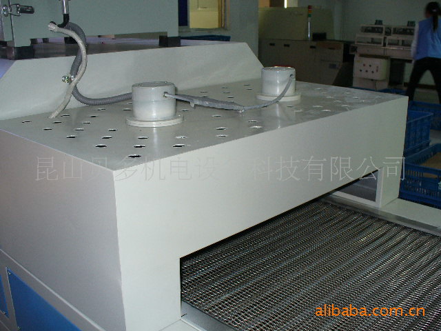 (1) 外形部分:外形尺寸:总长3.5米,外宽0.8米,网带宽0.6米,进料部分长0.7米,出料部分长0.5米,光源部分1.5米,加温流平区0.8米,外壳采用2厘冷板折弯而成,整机喷塑(非普通喷油);耐腐蚀,易清洗。