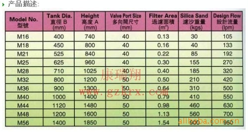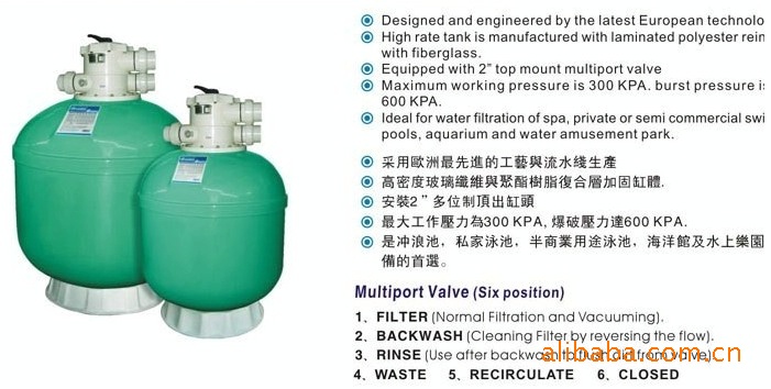 主要以先进的玻璃纤维及聚脂造成,以确保过滤器结构坚固,不易磨损,耐用。过滤器之六位阀,可作六种不同程序(过滤、不经过滤器排水关闭、反冲洗、不经过滤器循环、清洗滤咀),操作简便,可配用多种滤材使用,例如过滤沙、活性炭、树脂等。特别适合食水净化、污水处理、泳池、鱼池、按摩池等使用。