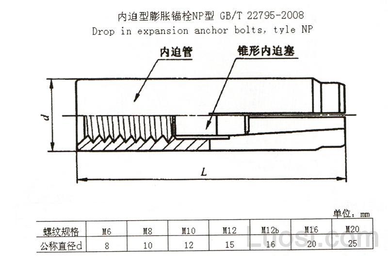 本公司所提供的GB /T 22795-2008 内迫型膨胀锚栓尺寸大小参数如下: