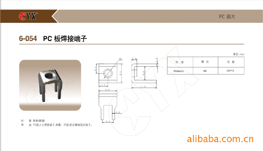用 途:PC板上之焊接端子,美观、牢固、配合螺丝固定端子。