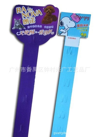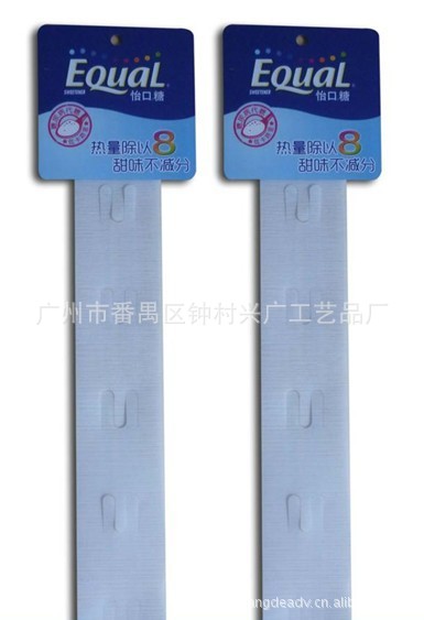PP磨砂挂条,超市挂物条,采用0.5MM厚双面磨砂PP胶片,可在上面彩印企业LOGO,再开模冲切为可以挂小物件的长条.常规宽4CM,长60CM,挂孔位可根据客人要求订做.