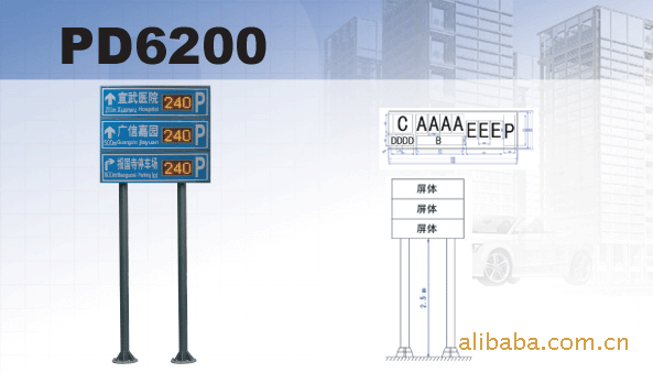 3. 屏体上有停车场中文名称、英文名称、方位箭头、距离和停车场标志等;