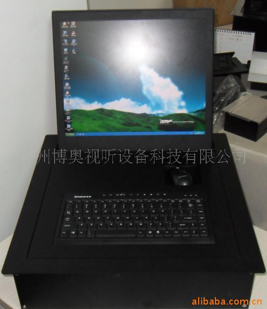 液晶显示屏翻转器主要应用于高档会议,交易厅,高级多媒体网络系统,办公家私场所,当打开翻转器时,显示屏会自动翻转成108°角度(图1),当不使用时,显示屏可通过遥埪(或中控,集控)自动翻转隐藏于桌面内部(图2)。产品采用标准化结构,设计精巧,具有防盗,防尘美化桌面等功能。