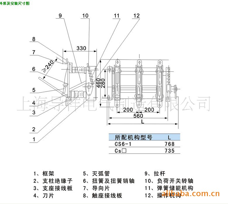 负荷开关由底座、绝缘子、动、静触刀、弧触头及灭弧室,传动机构及弹簧储能机构,熔断器与CS6或园盘操作机构等组成,可与接地开关连体,并具有连锁装置。