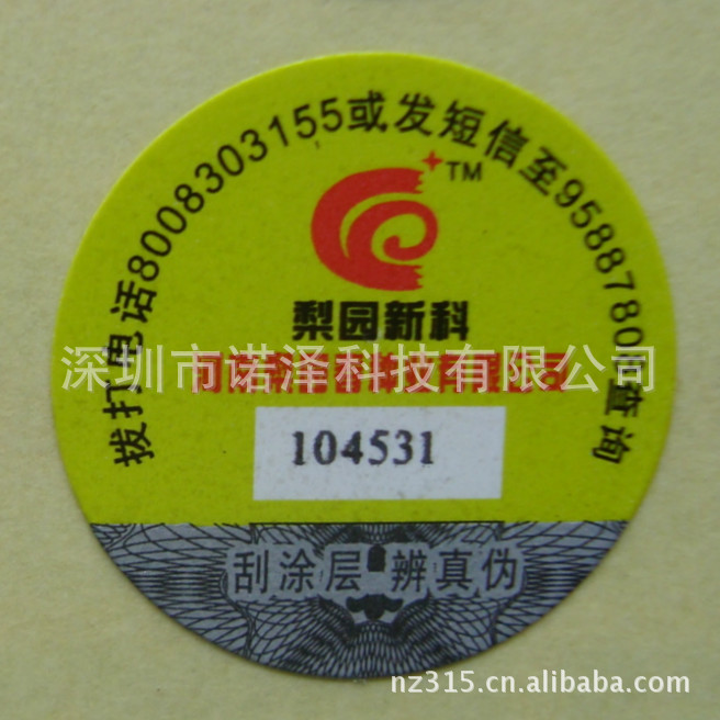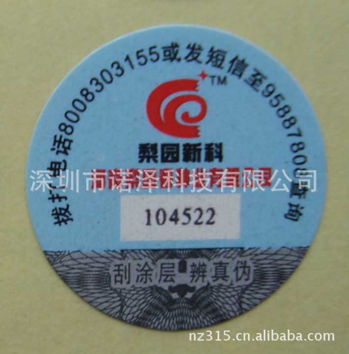 深圳诺泽防伪,专注于各类防伪标签,电码防伪、数码防伪、激光防伪、滴水消失防伪、加温变色防伪、荧光油墨防伪、易碎纸防伪、高端镭射防伪、安全线防伪等、技术种类多。欢迎来电洽谈:18923791315 公司官网:http://www.nz315.net/ QQ:224410062