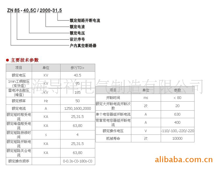 ZN85-40.5/T2000-31.5型户内高压真空断路器(以下简称断路器),适用于三相交流50Hz,额定电压40.5KV电力系统中,可供工矿企业、发电厂及变电站作为分合负荷电流、过载电流、故障电流之用。