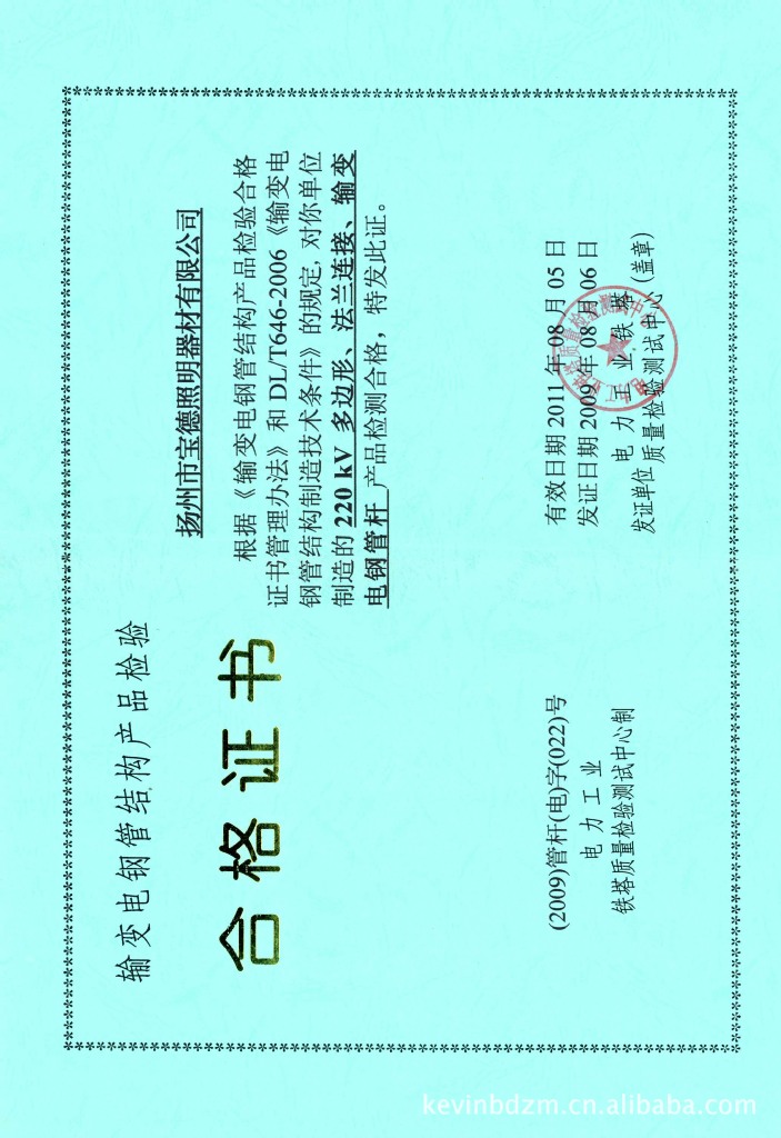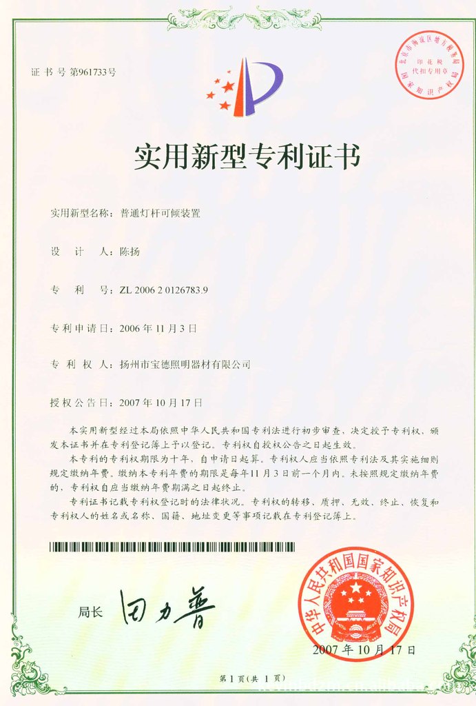 多年来,公司连续被评为“重合同守信用企业”、“AAA级资信企业”、 “执行标准优秀企业” 、 “质量管理优秀企业”,荣获《扬州市知名商标证书》、《江苏省名牌产品证书》、《太阳能路灯高新技术产品认定证书》顺利通过了ISO9001:2000质量管理体系认证、ISO14001:2004环境管理体系认证、产品通过了“CCC”认证和“CQC”认证、国家民航总局颁发的《机场照明高杆灯使用许可证》,同时具有《安全生产许可证》和《道路照明工程一级施工资质》、《输变电钢管结构产品检验合格证书》、《广播通讯铁塔及桅杆产品生产合格证书》及《交通信号灯合格证书》等。